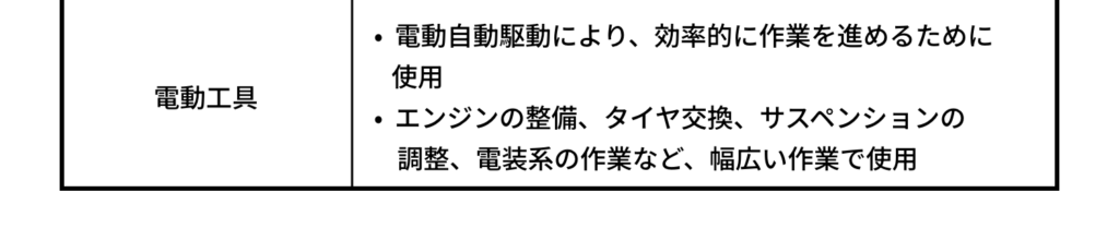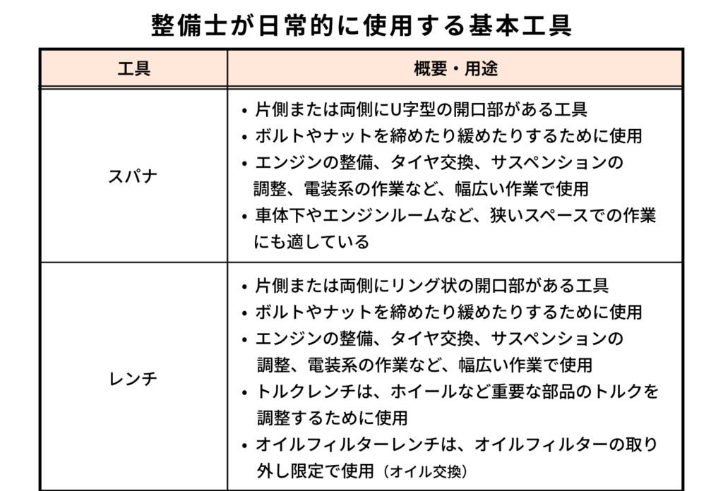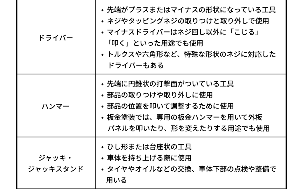 基本工具は、点検・整備・修理などすべての作業で欠かせないものです。ドライバーやハンマーのように家庭でも使われる工具から、スパナやレンチのように整備に特化した工具まで幅広く使います。代表的な基本工具を表にまとめました。