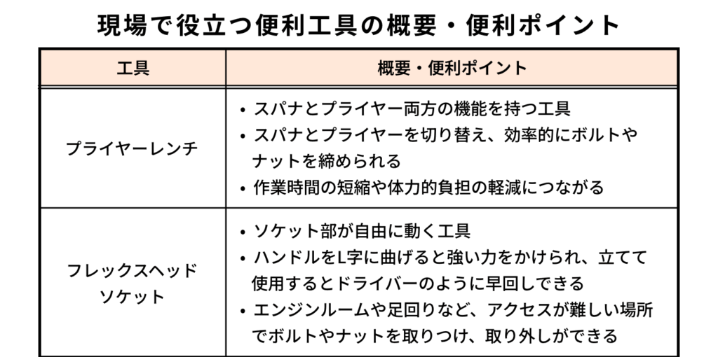 基本工具だけでは対応できない作業や、効率を上げたい場面で活躍するのが便利工具です。