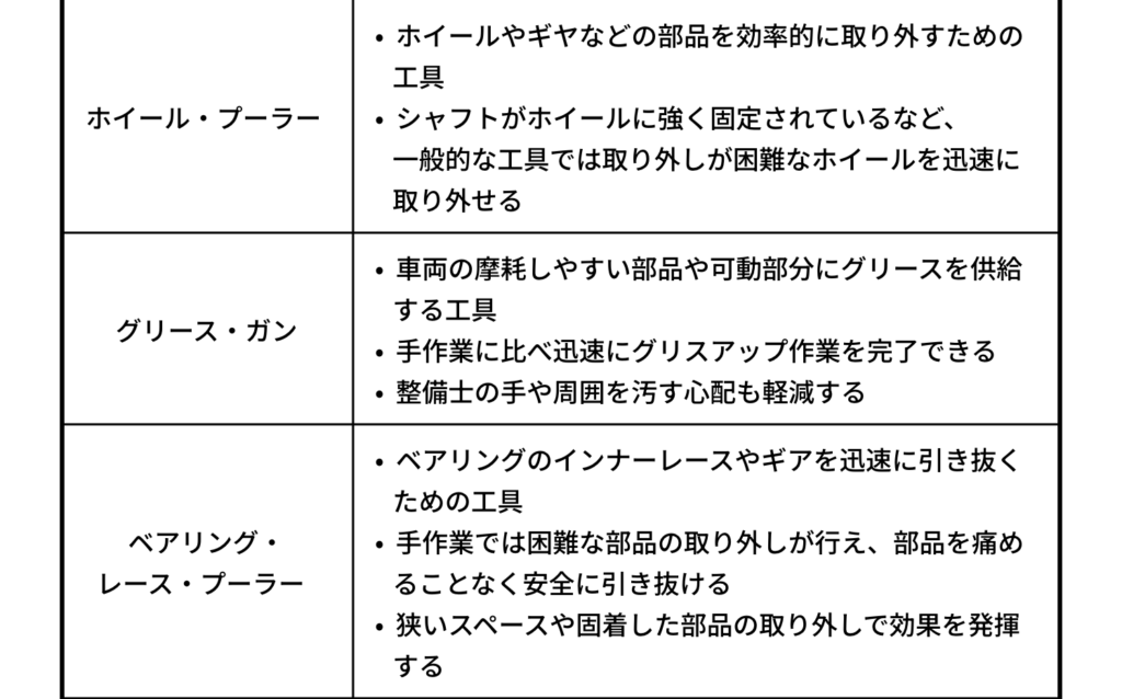 基本工具だけでは対応できない作業や、時間と体力がかかる作業をサポートするのが便利工具です。効率化や時短につながるため、自動車整備士にとっては積極的に取り入れたいアイテムです。