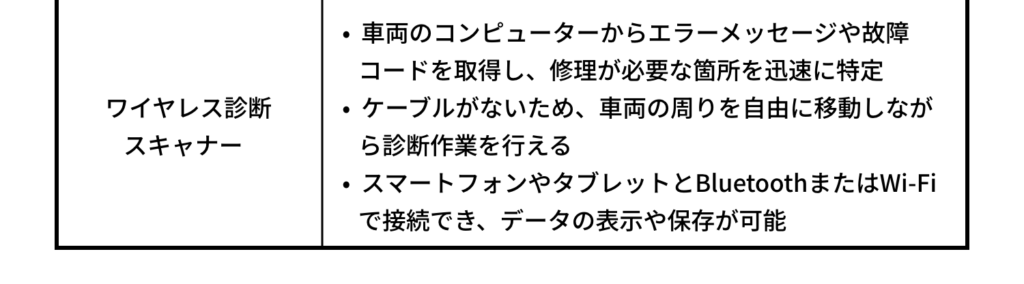スキャンツールは、車両の故障コードやセンサー情報を読み取る機器で、電子制御が進んだ現代の自動車には欠かせません。故障箇所の特定や診断に必須のツールといえるでしょう。