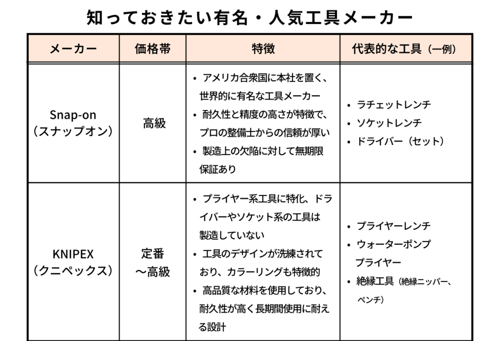 どちらも品揃えが豊富で、初めての工具選びで迷う方にとって安心できるメーカーです。