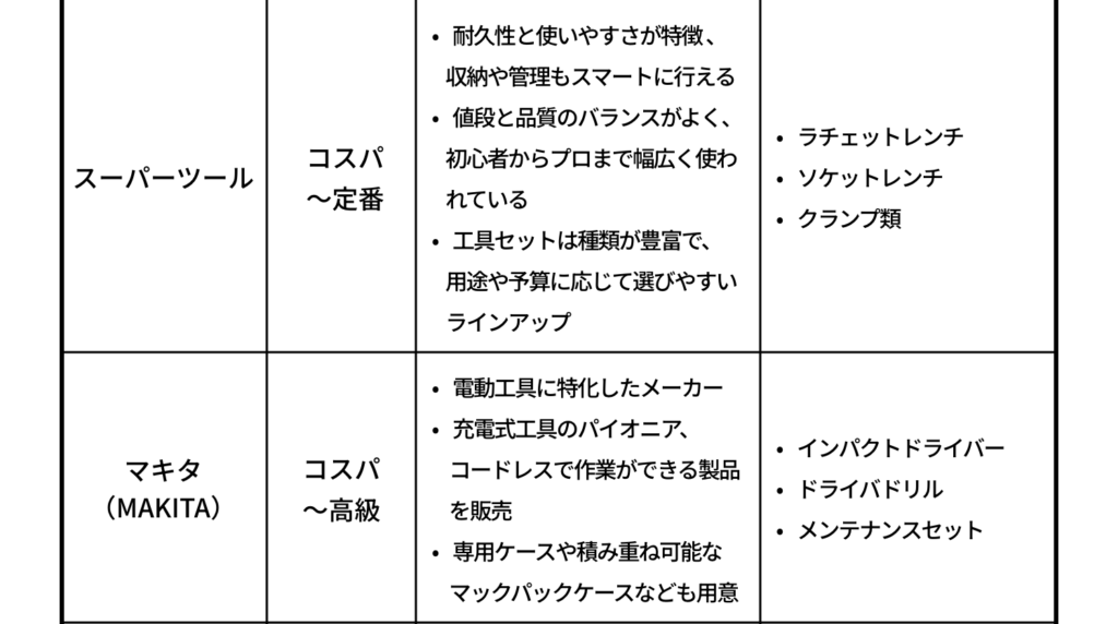 • スーパーツール:価格が手ごろで、使いやすく耐久性も十分。初心者からプロまで幅広く支持。