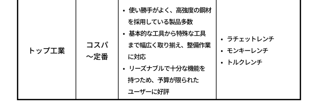 さらに、「トップ工業」は基本工具から特殊工具まで幅広く揃え、手頃な価格帯で支持されています。